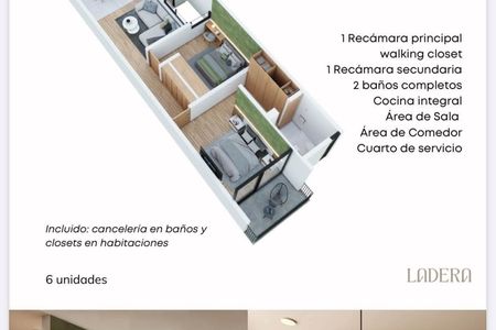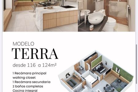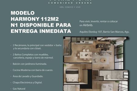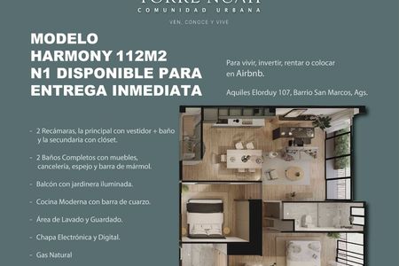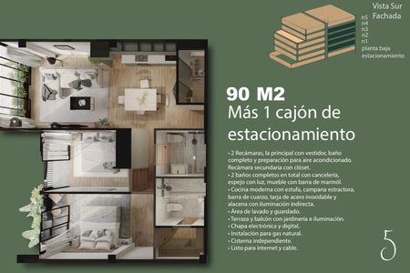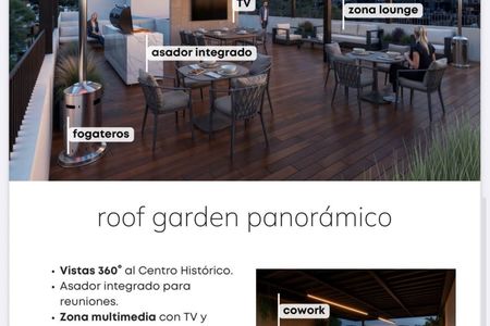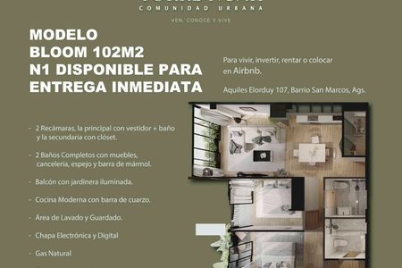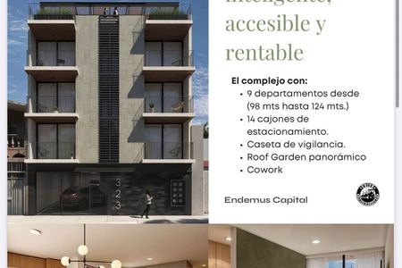 Departamento de 105mts , cuenta con 2 recámaras la ppal con vestidor, baño completo y balcón, cocina integral con granito, isla y campana. Area de lavado,video portero y portón eléctrico, instalaciones para internet y aire acondicionado, 1 cajón de estacionamiento, closet de blancos. Roof garden de 220mts con área de asadores, billar,tv, coworking y terraza.