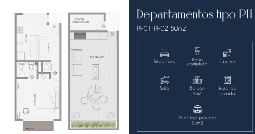 • Departamento 603 Exterior PH Tipo B – 80 m² (Incluye roof top privado de 35 m²)