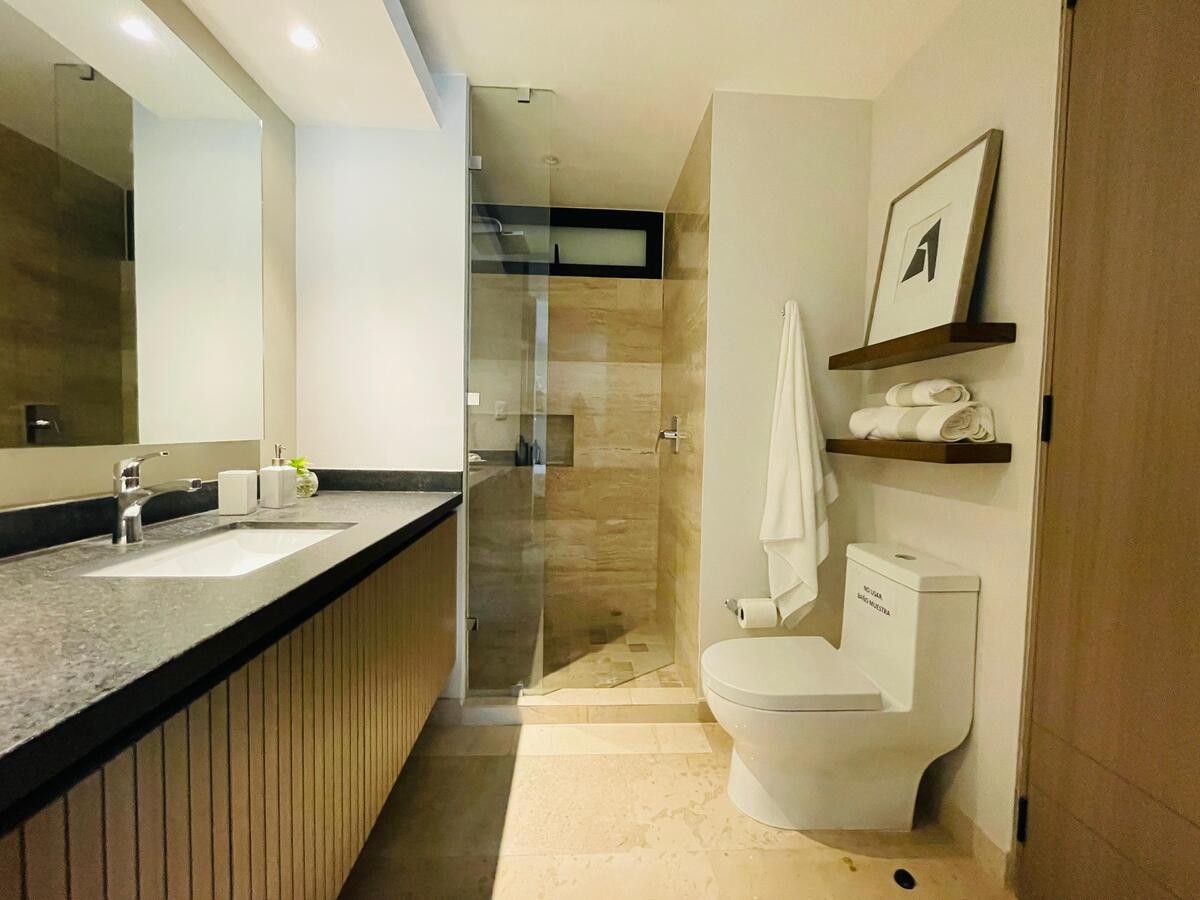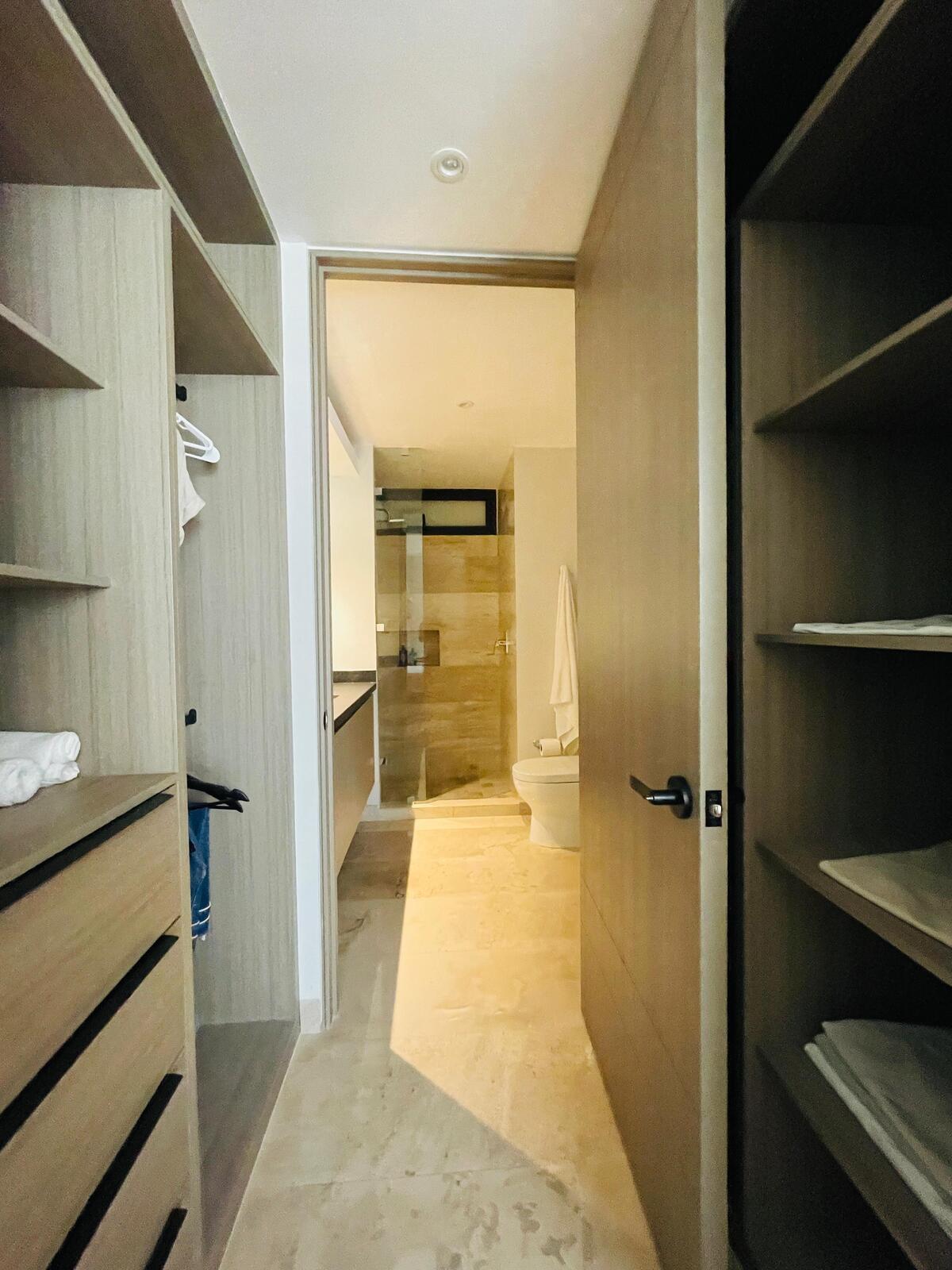 Recámara principal con clóset vestidor y baño completo.