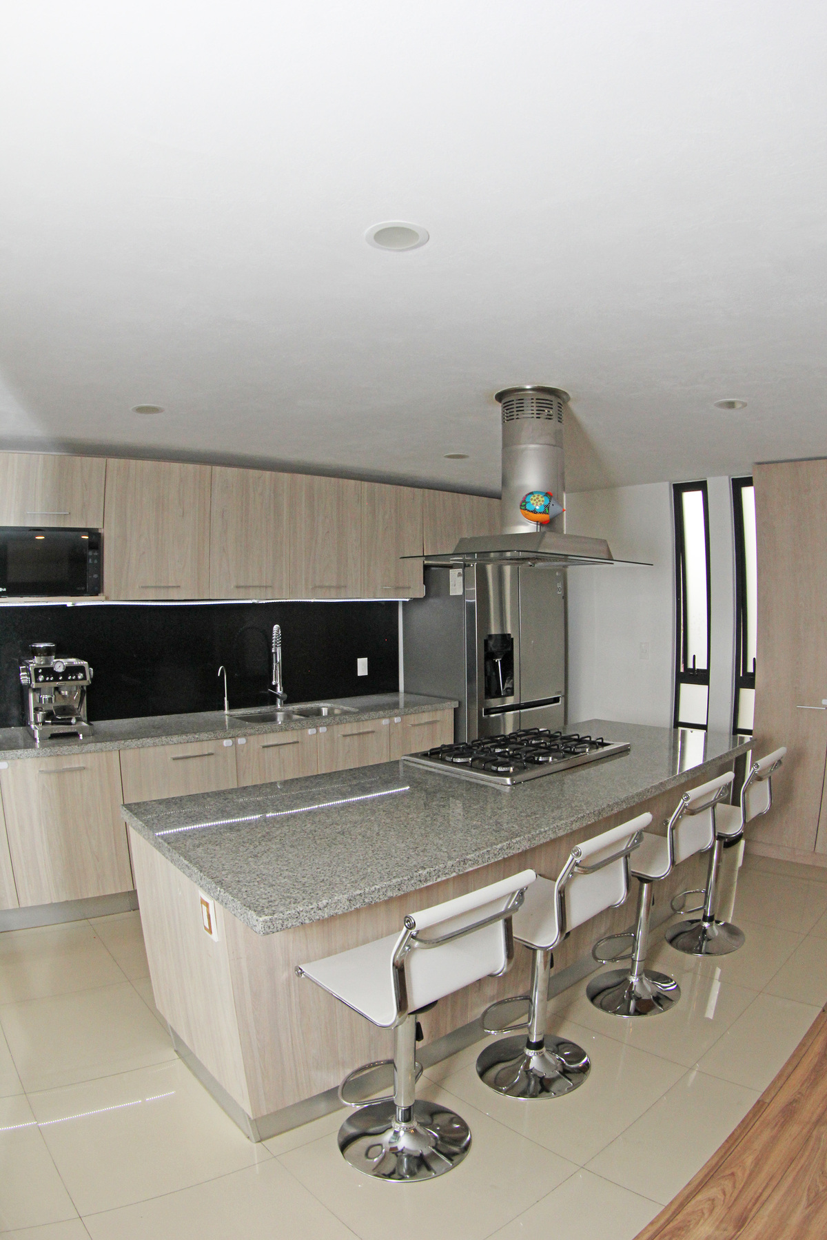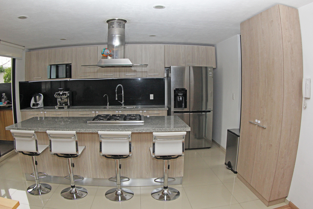 Primer nivel: Estancia sala y comedor con gran iluminación natural, Medio baño de visitas, Cocina integral abierta con isla central y desayunador, amplia alacena.