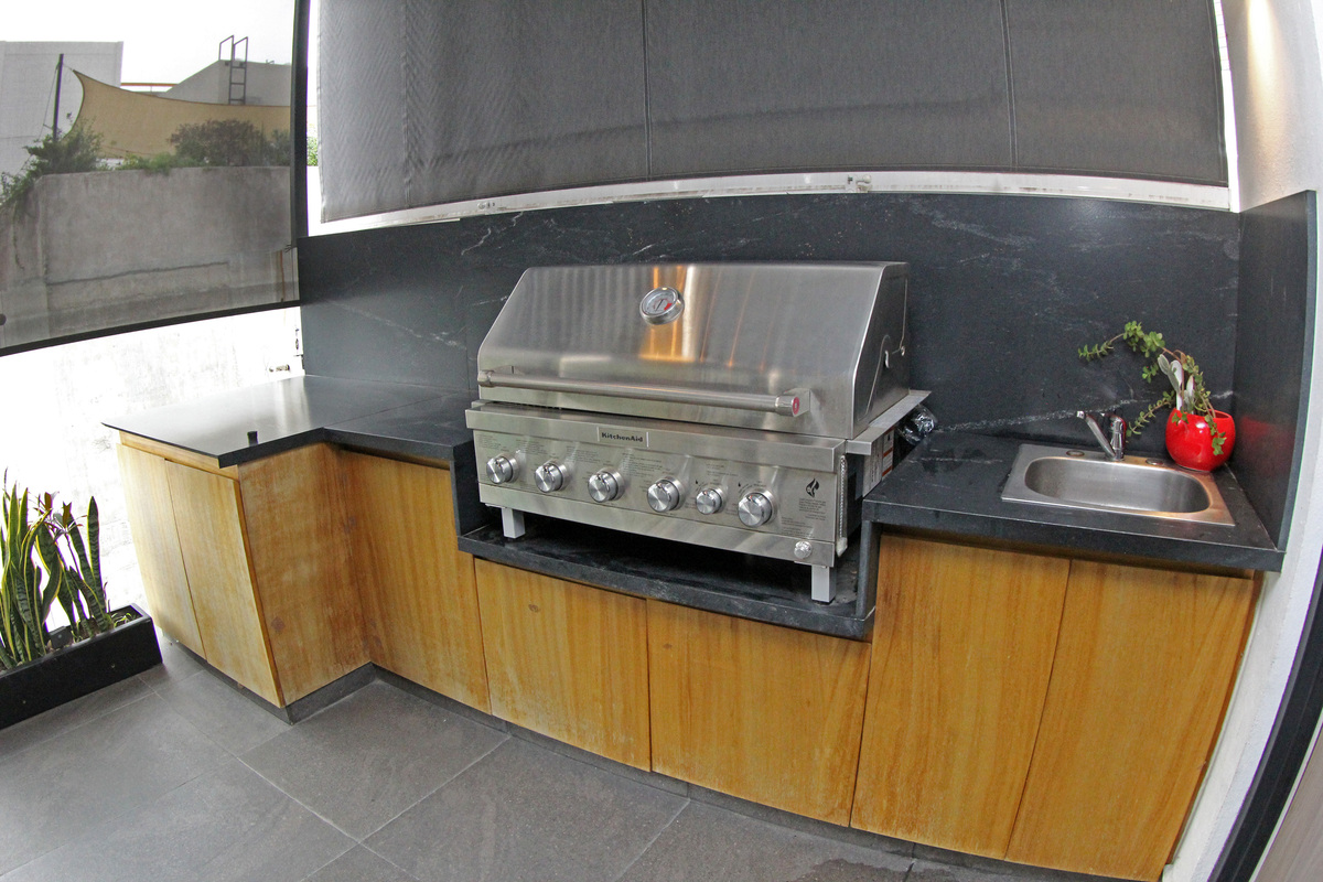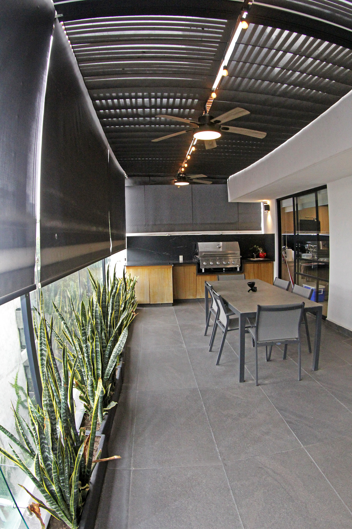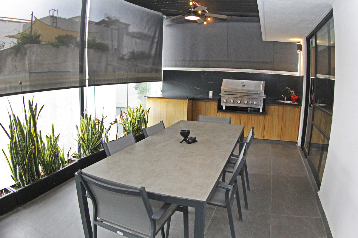 Terraza techada con pérgola, persianas motorizadas, asador de gas KitchenAid y tarja, ideal para reuniones familiares o con amigos