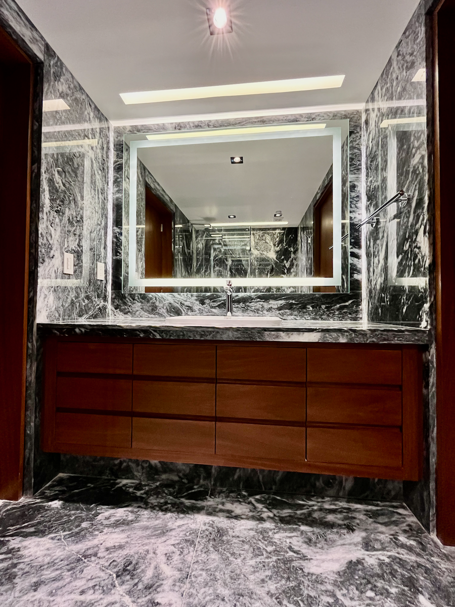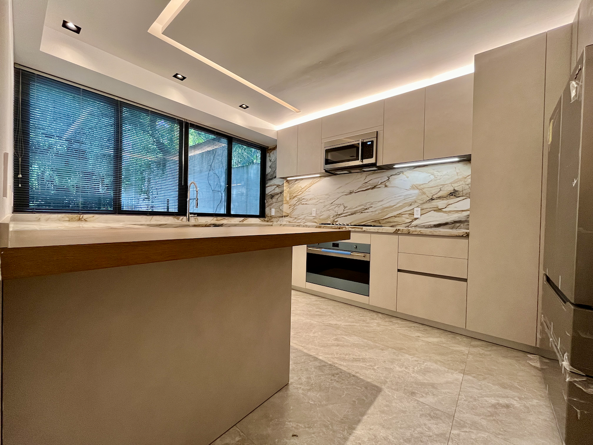 La cocina cerrada, completamente revestida en mármol. Además, el baño de visitas, también con acabados en mármol, agrega un toque de sofisticación adicional.