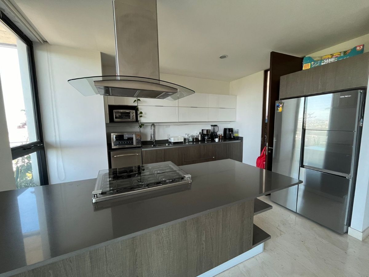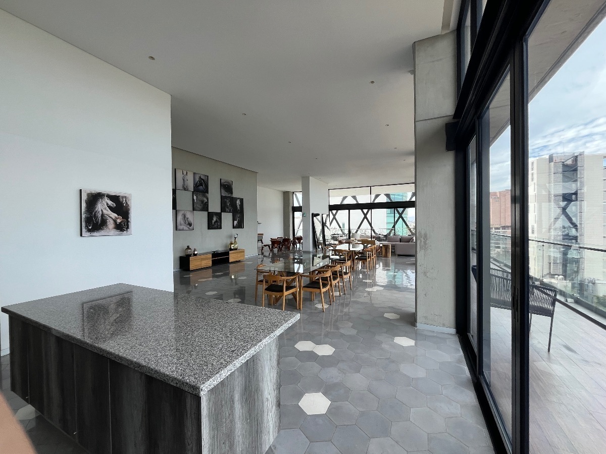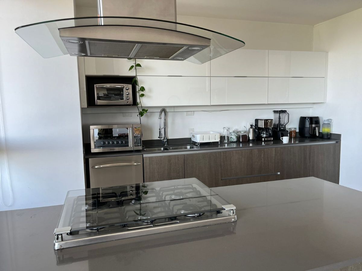 La cocina integral, equipada con granito y una imponente campana de aluminio sobre una isla central, combina funcionalidad y estilo a la perfección. Con una altura de 2.70 metros, los espacios del departamento se sienten amplios y aireados, realzando la sensación de lujo y confort.