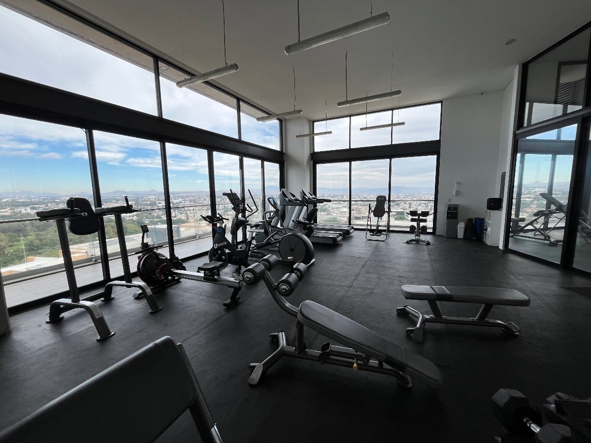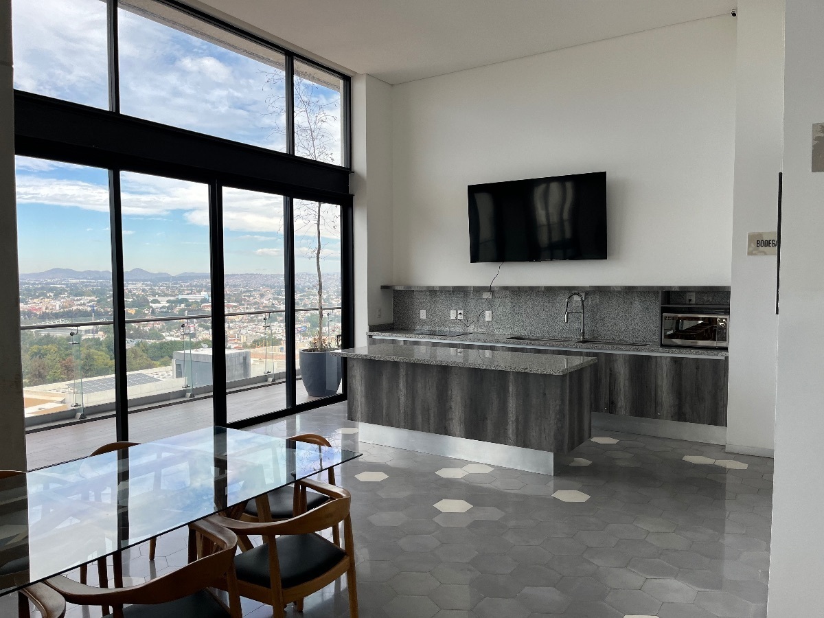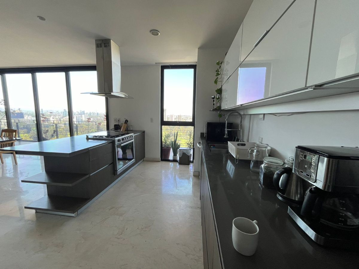 La cocina integral, equipada con granito y una imponente campana de aluminio sobre una isla central, combina funcionalidad y estilo a la perfección. Con una altura de 2.70 metros, los espacios del departamento se sienten amplios y aireados, realzando la sensación de lujo y confort.