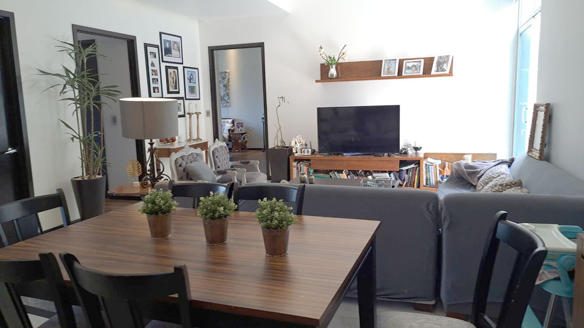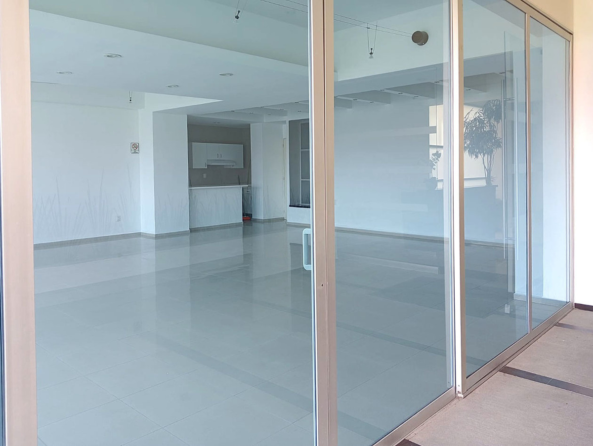 Sala - comedor con acceso a una pequeña terraza, recámaras con grandes ventanales con vista hacia el jardín.