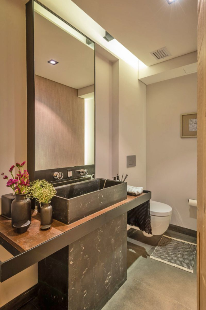 Pisos de mármore na sala, combinados com madeiras de Eucalipto e Carvalho nas paredes e madeira engenheirada no andar superior. Design de iluminação e cabeamento para sonorização.