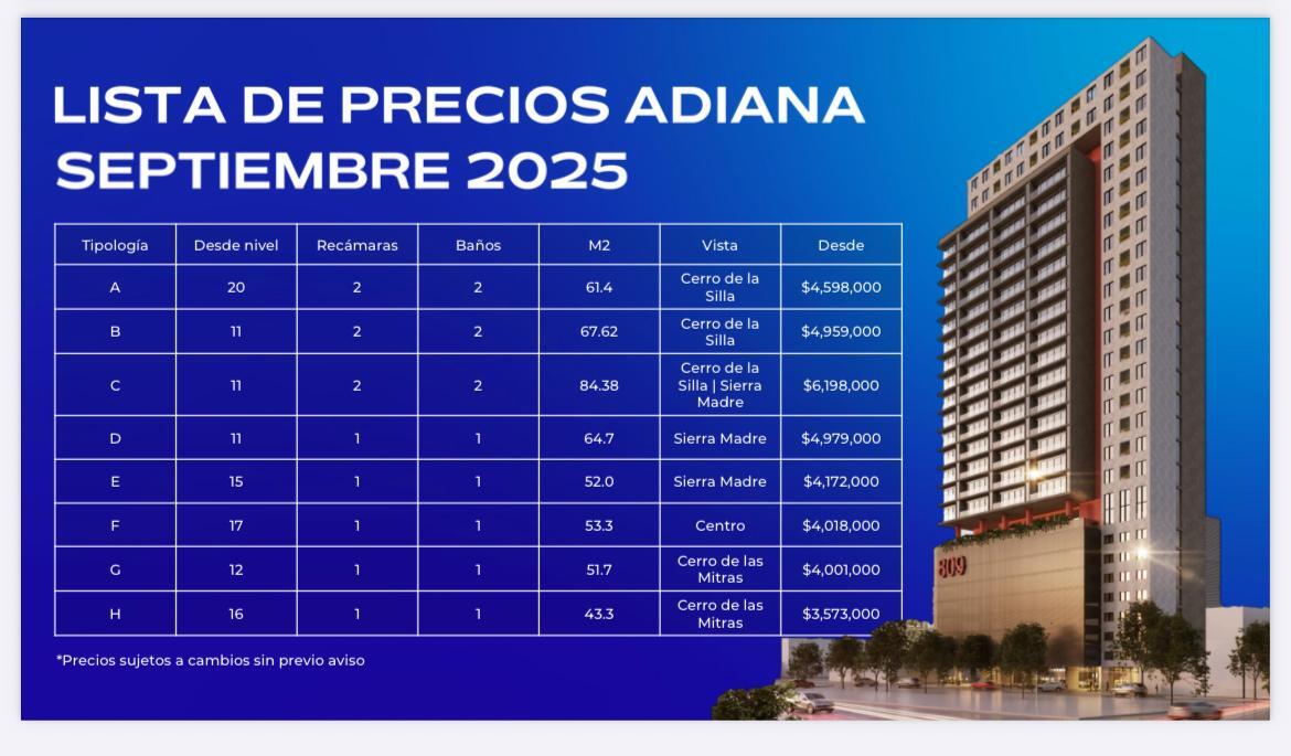 ADIANA é o novo projeto em Monterrey, projetado pelo arquiteto Mayer Hasbani, focado em realçar o potencial de uma vida elevada na cidade. Contará com apartamentos residenciais e espaços comerciais, além de suas modernas e incríveis comodidades, como academia, biblioteca de compartilhamento de ferramentas, piscina aquecida, área de jacuzzi, sky lounge, sala social, churrasqueiras, jardim na varanda, espaço de coworking, cozinha de chef, suítes para hóspedes e depósito.