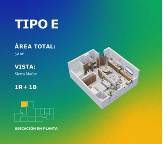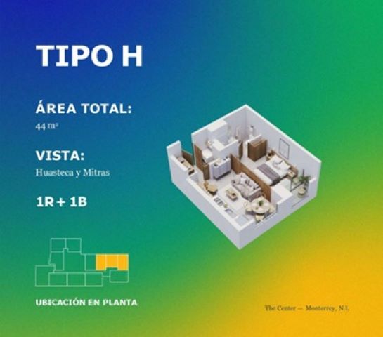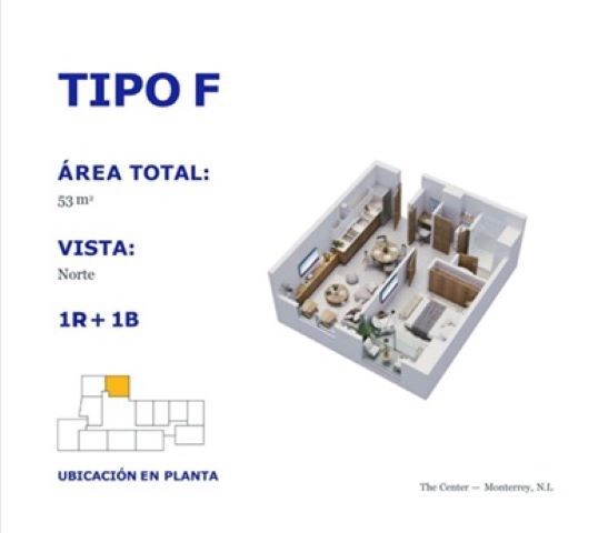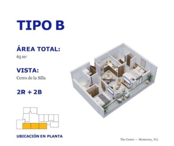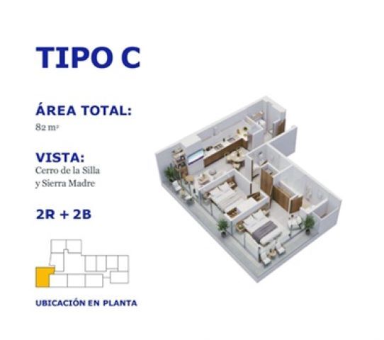 Departamento Tipo A - de 61m2, cuenta con área de sala, cocina, centro de lavado, 2 recámaras la principal con walk in closet y baño completo, la segunda recámara comparte baño con el área social, balcón con vistas al Cerro de la Silla.