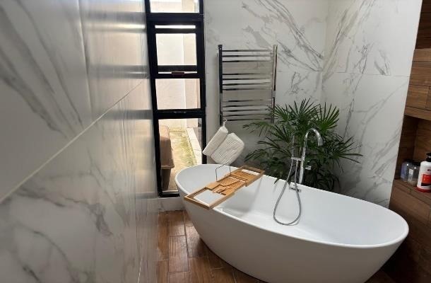 Dois quartos com banheiros, um dos quais possui closet e banheira