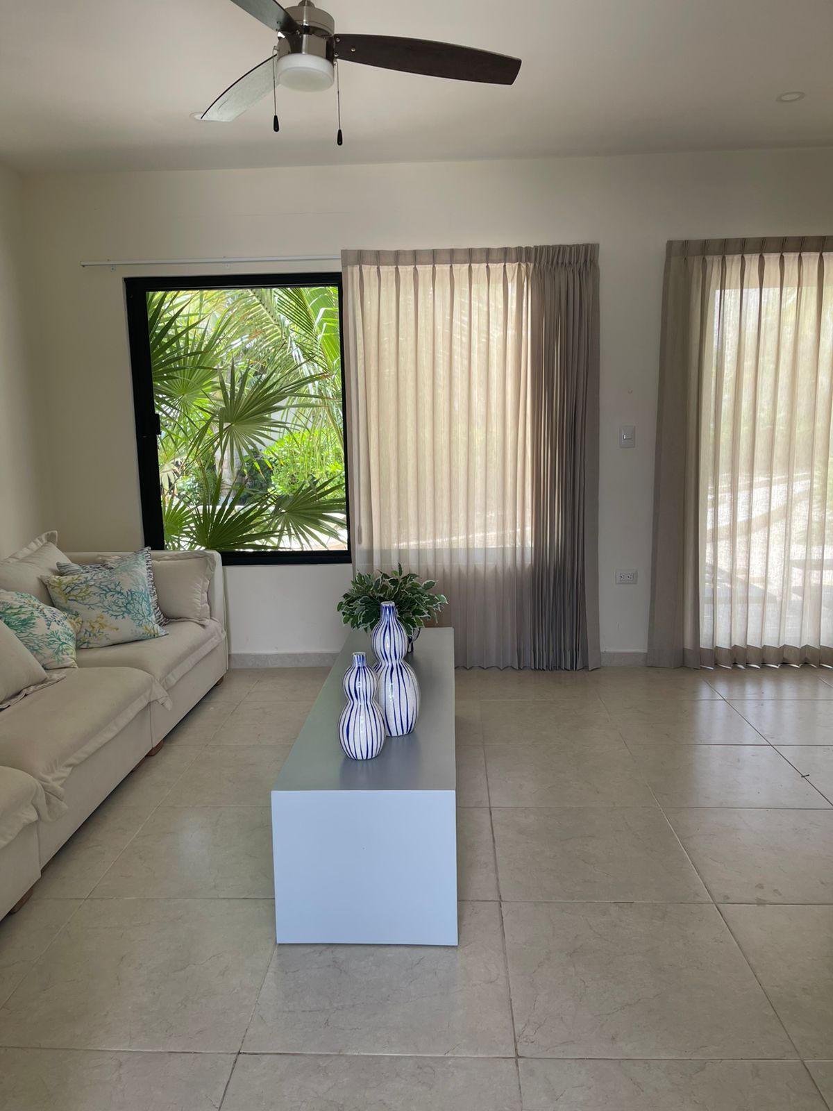 Ar-condicionado e ventiladores de teto em todos os quartos, incluindo a sala de estar e jantar