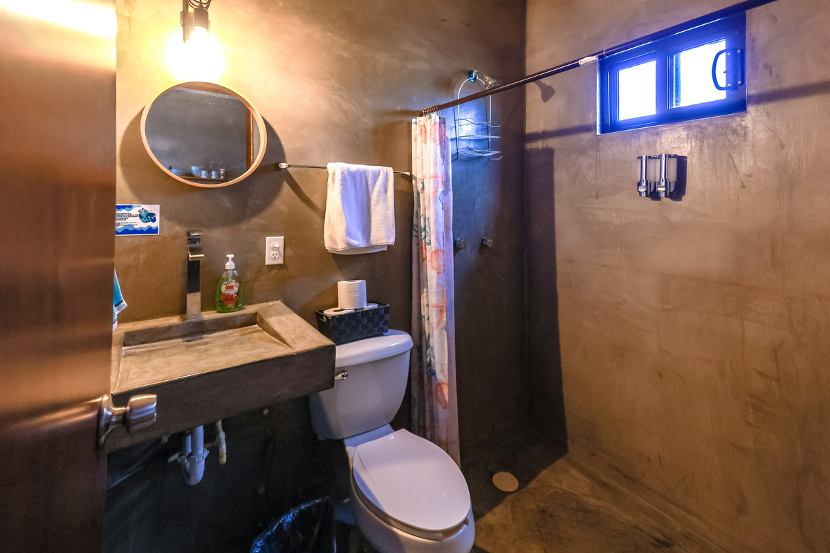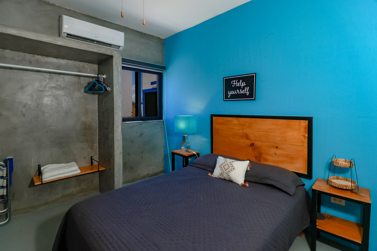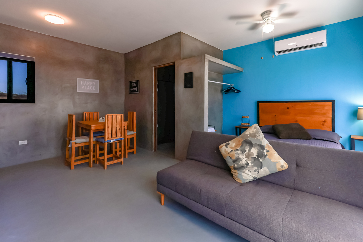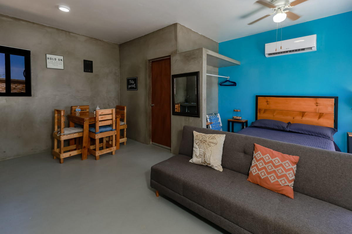 Entre sus comodidades, se incluyen aire acondicionado, ventilador, calentador de agua, cocina equipada con utensilios, parrilla de dos quemadores, cafetera, licuadora, platos, vasos, tazas, servibar, TV, clóset, baño completo, una cama matrimonial, un sofá cama, toallas, sábanas y cobijas.