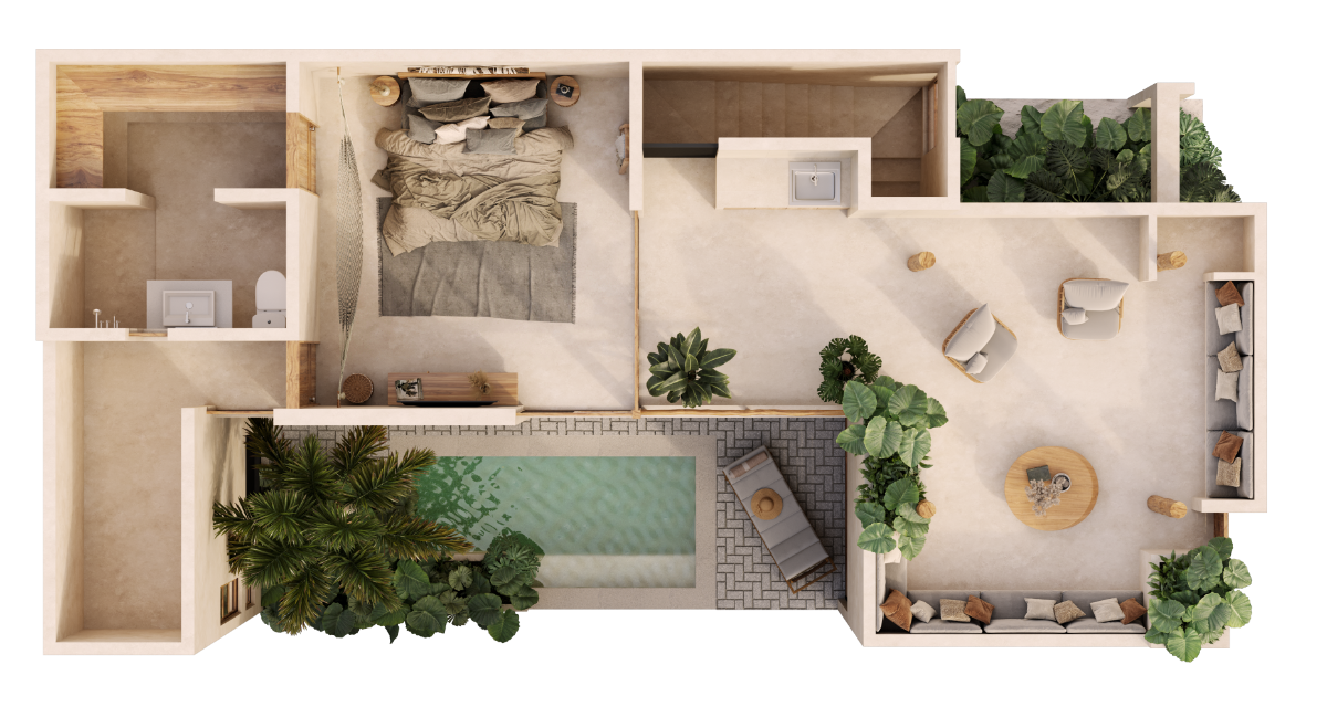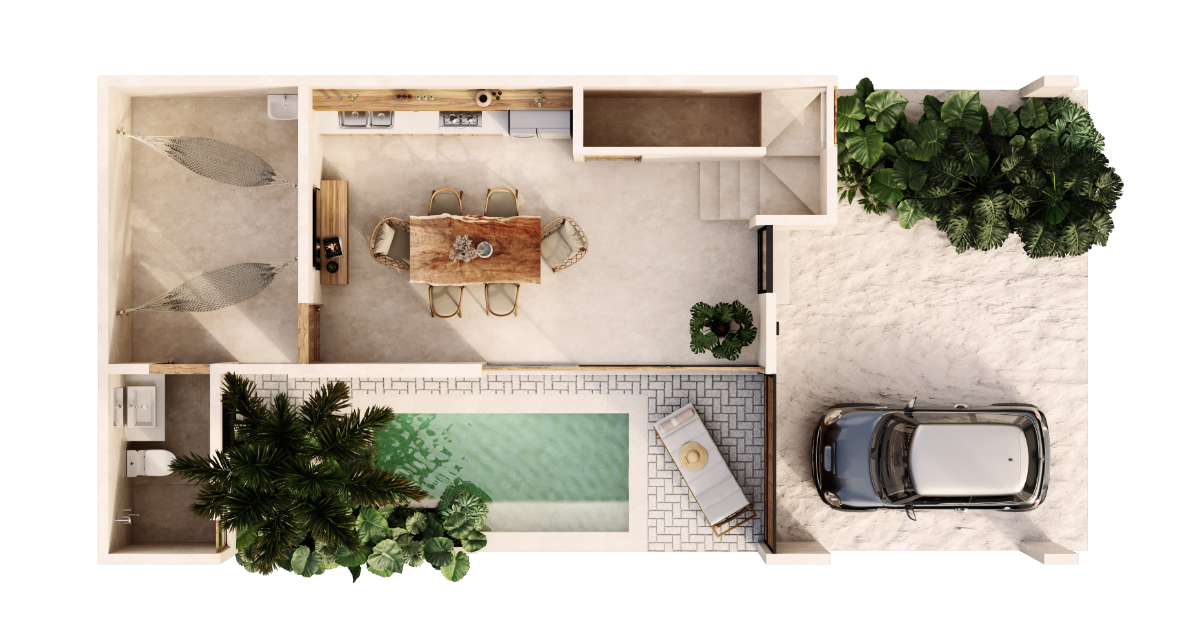 Sala y comedor abiertos: Espacios luminosos con grandes ventanales y puertas corredizas que conectan con la alberca privada (4m x 1.85m) en acabado chukum, ideal para relajarte o recibir visitas.